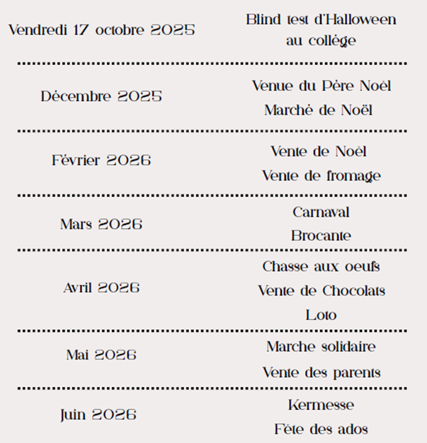 Chaque année, nous organisons et animons des actions à destination des élèves et des parents. Nous proposons également des ventes dont les profits nous permettent de reverser de l’argent à l’établissement. Nous avons également pour mission de vous représenter et de vous accompagner.