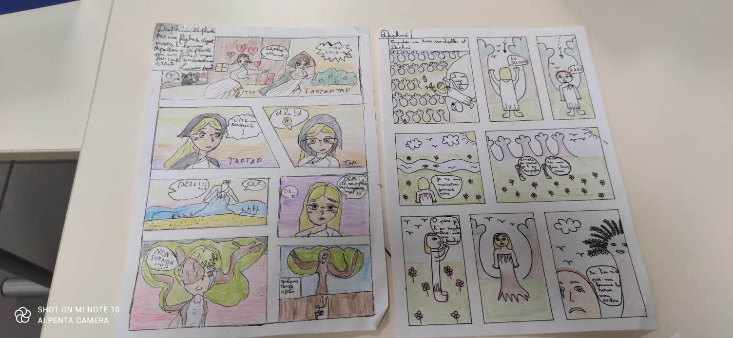 L’EPI des sixièmes consistait à travailler sur les métamorphoses du poète latin Ovide. Ils devaient rendre compte de leur lecture de l’une d’elles sous forme de BD. Après avoir revu tout le lexique de cet art, ils se sont lancés dans la réalisation de leur planche. Ils ont pu approfondir leurs connaissances sur la mythologie gréco-romaine en se rendant au musée gallo-roman de Sain-Romain-en-Gal. Ce fut une semaine riche de découvertes en connaissances et en savoir-faire.
